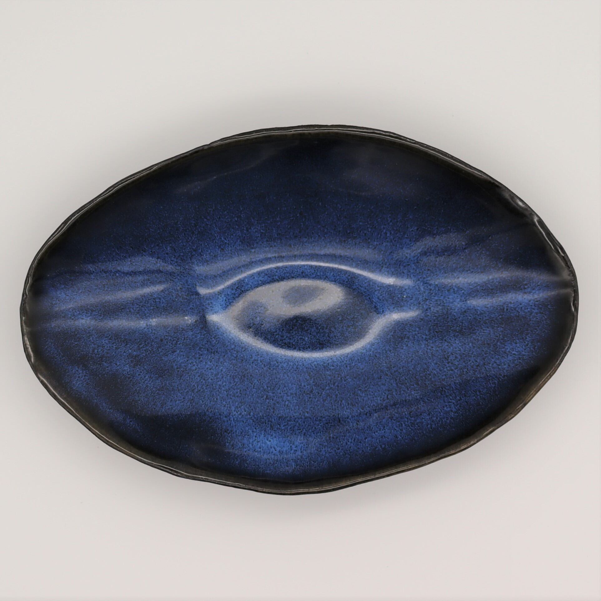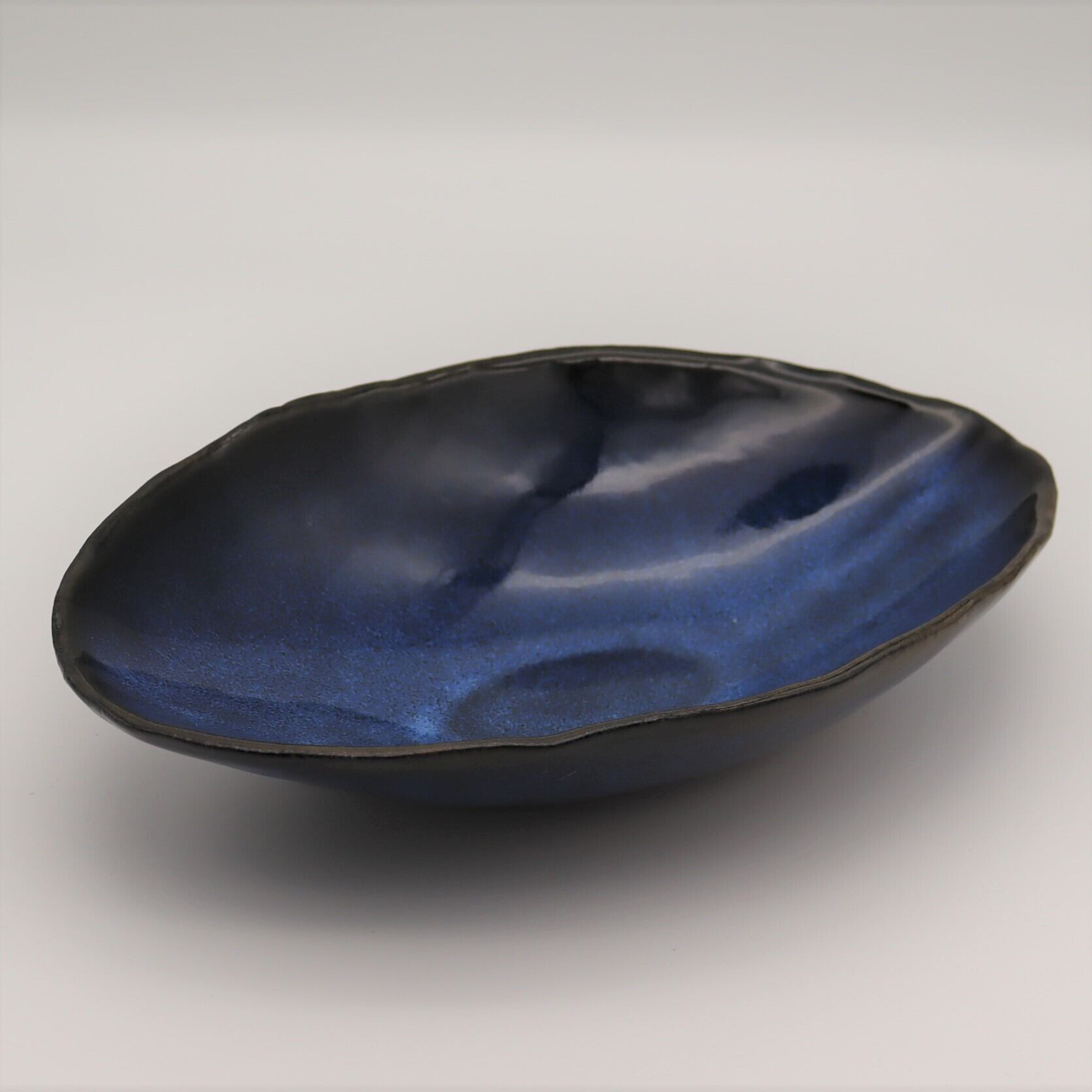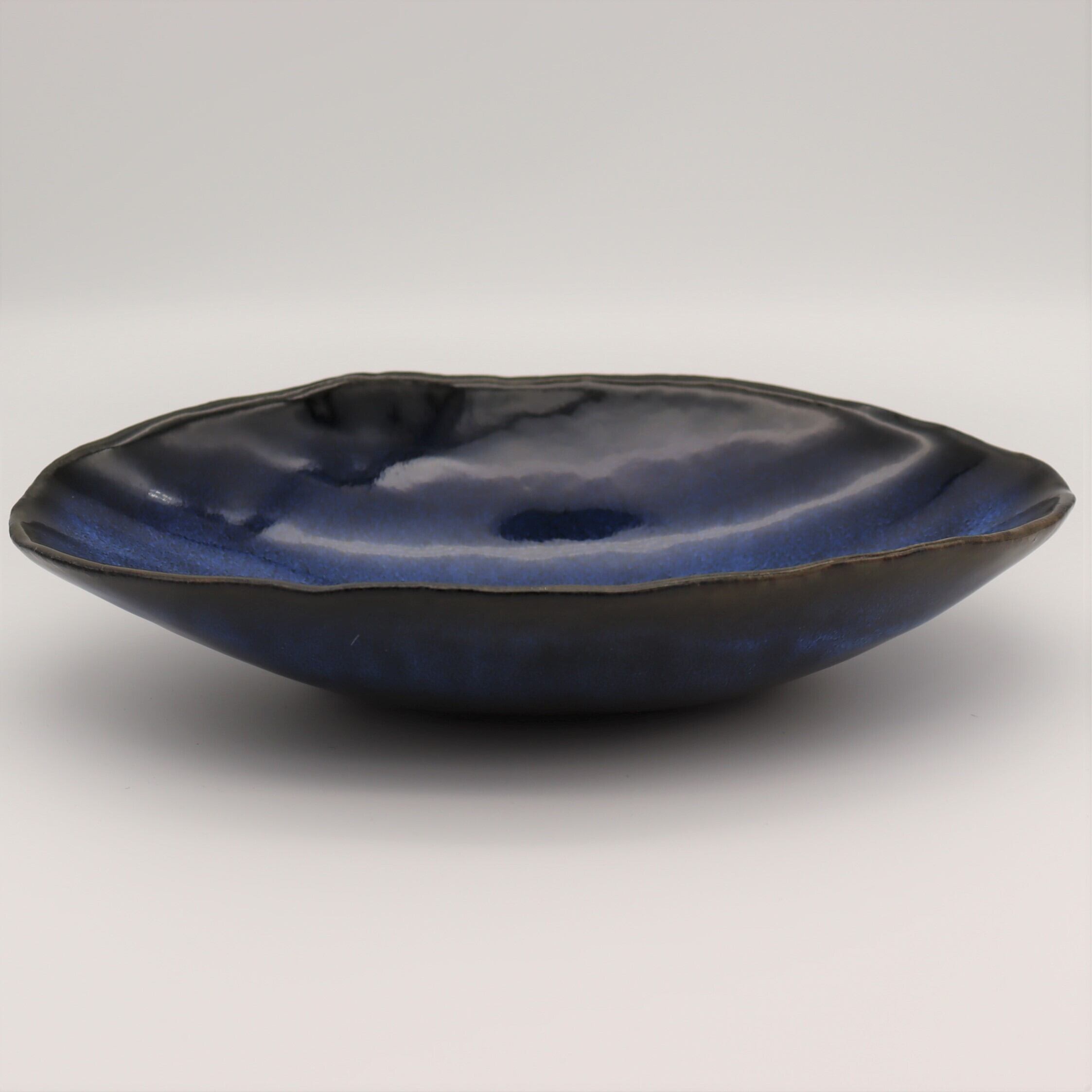 全体は深みのある濃紺の肌。下地の黒い部分と青白い釉が混ざり合い、絶妙な景色を創っている。サラダ、パスタ、カレーなど用途はいろいろ。